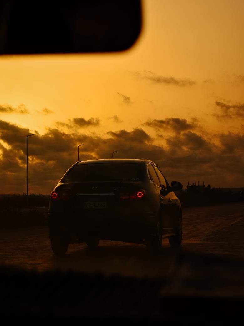 سيارة تسير عند غروب الشمس على طريق ذو مناظر خلابة