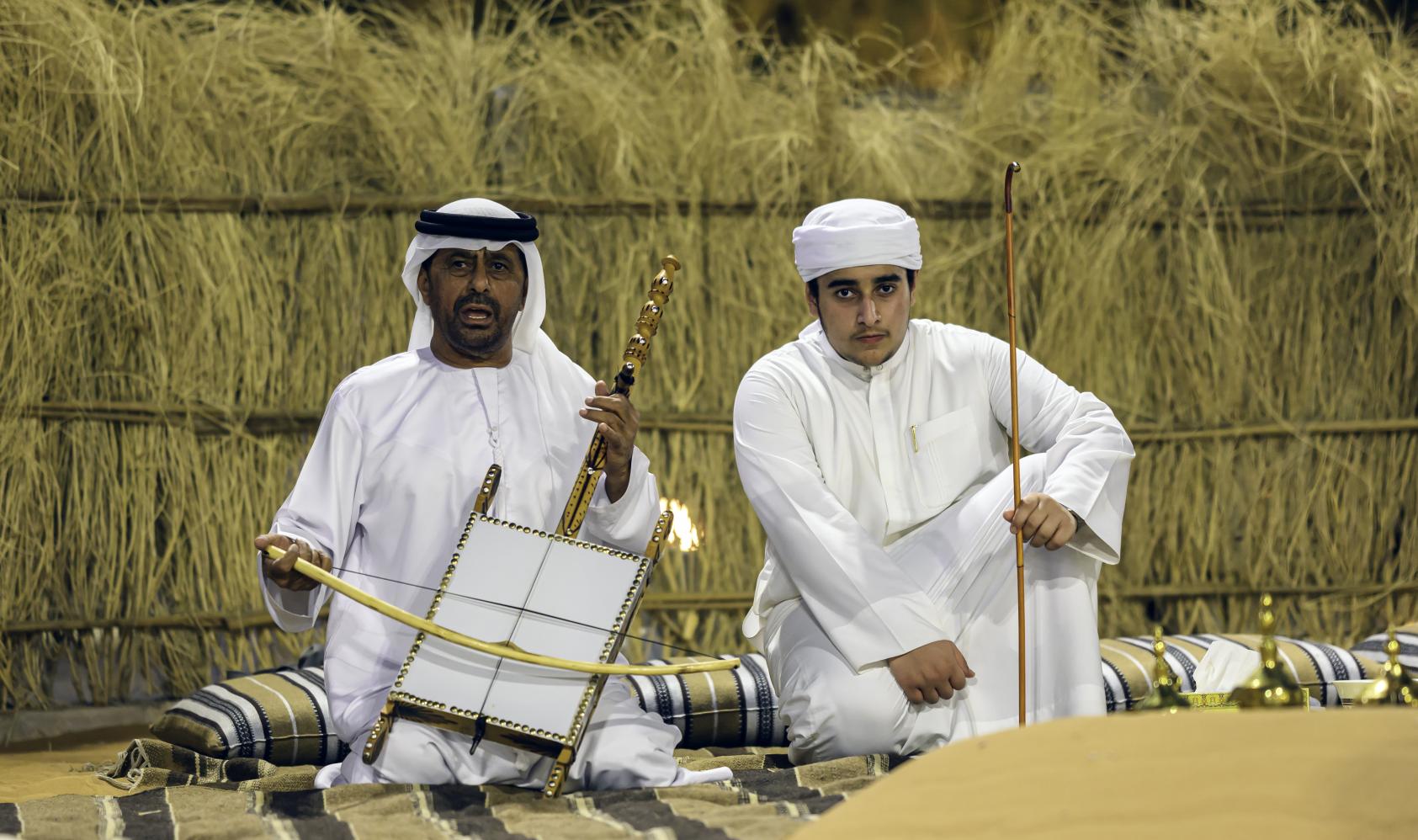 عرض موسيقي ثقافي يضم آلات تقليدية في مهرجان القطارة في العين، الإمارات.