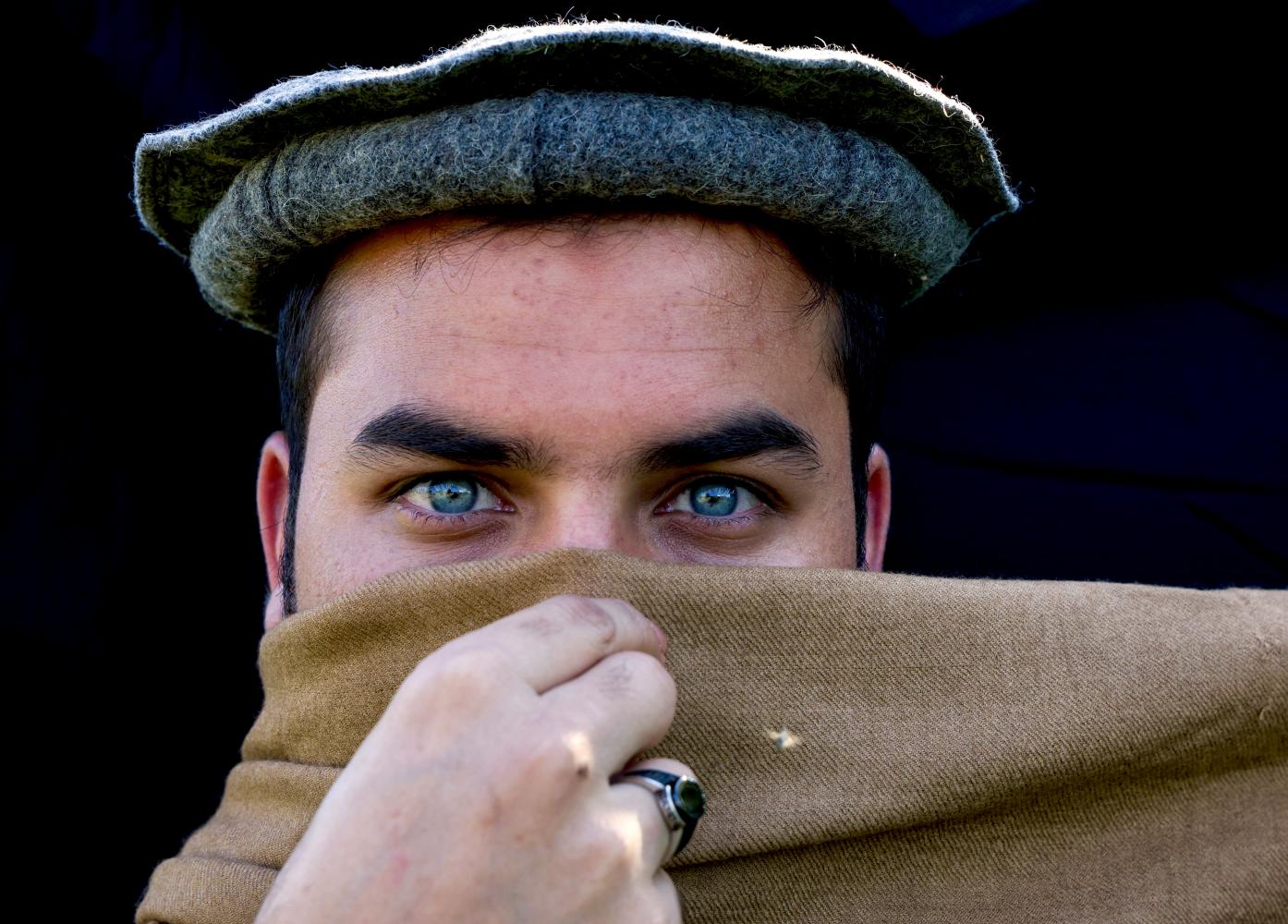 Captivating portrait of a man with bright eyes peeking over a fabric, wearing traditional headwear.