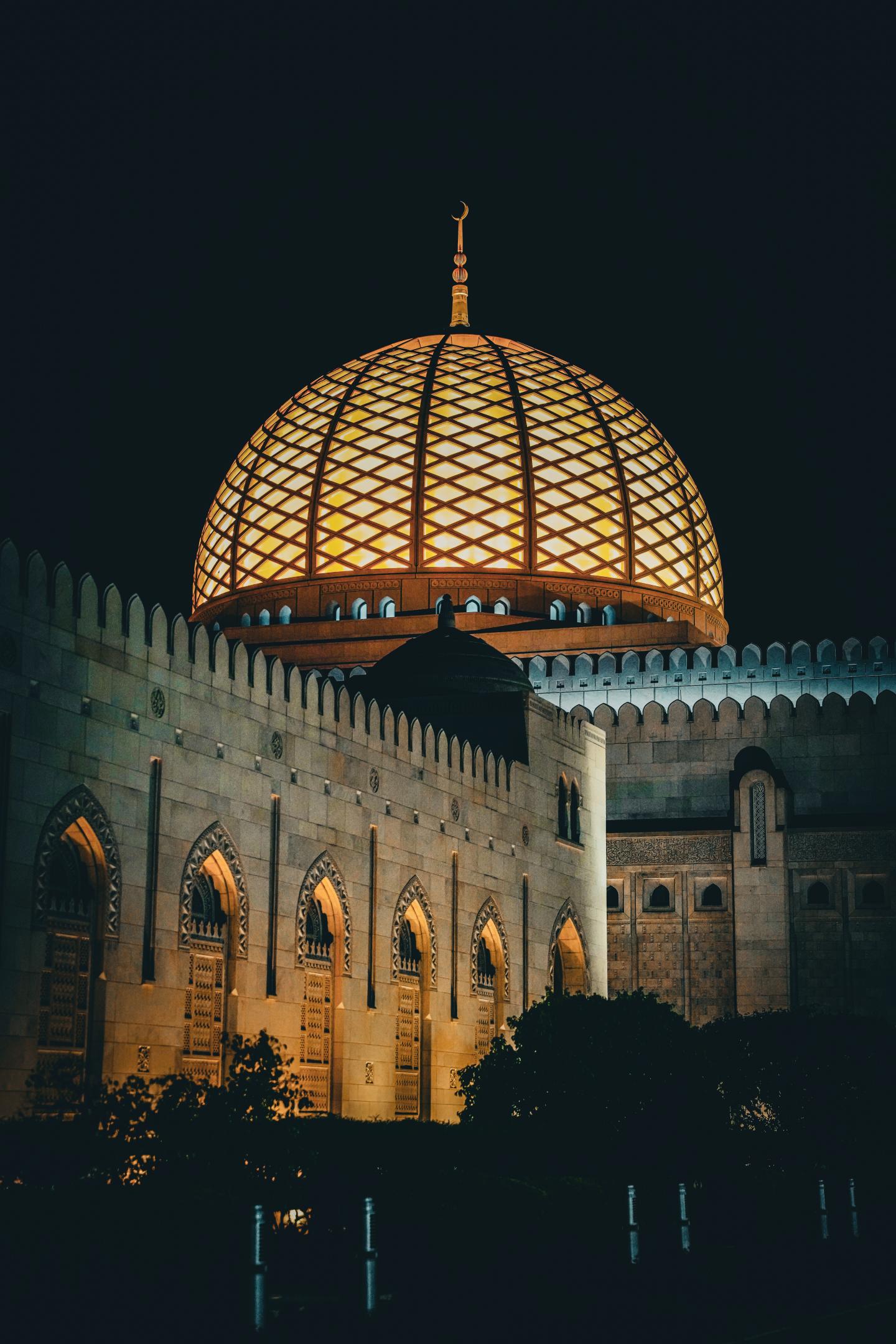 A captivating view of the Sultan Qaboos Grand Mosque dome illuminated at night, showcasing Islamic architectural elegance.